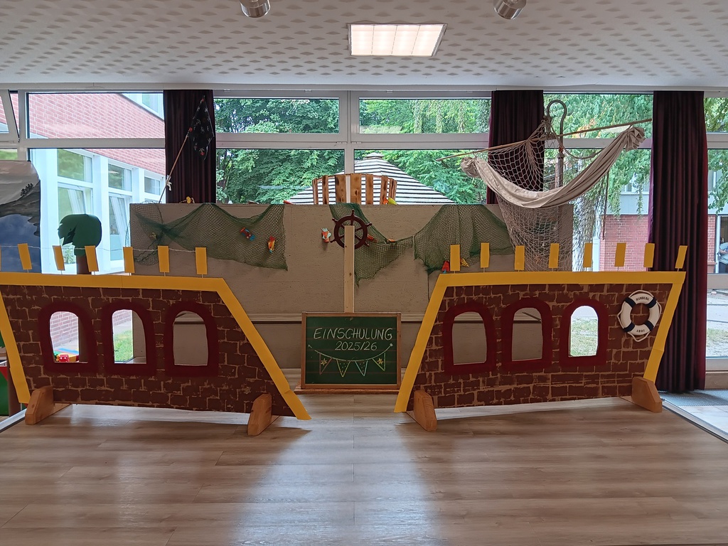 In der anschließenden Einschulungsfeier wurden die neuen MitschülerInnen von den Mädchen und Jungen der Klassen 2-4 mit piratenstarken Liedern, Wünschen und einem Tanz zum Wellermann- Song noch einmal herzlich willkommen geheißen. Zu unserem Schullied wurden die Einschulungskinder und ihre Lehrerinnen schließlich in ihre erste Unterrichtsstunde verabschiedet, in der die Kinder sogar ein Geschenk erhielten: Unser Förderverein hat für jedes Kind einen Anhänger als Erinnerung an die Einschulung verschenkt.