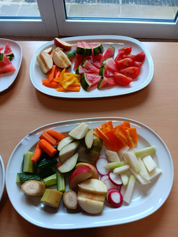....ist an unserer Schule das Schulobstprogramm wieder gestartet. Jede Woche von Dienstag bis Donnerstag erhalten alle Schülerinnen und Schüler frisches Obst und Gemüse zum Frühstück. Viele Eltern und Großeltern haben sich bereit erklärt, dieses für die Kinder zuvor klein zu schneiden und auf Platten anzurichten.