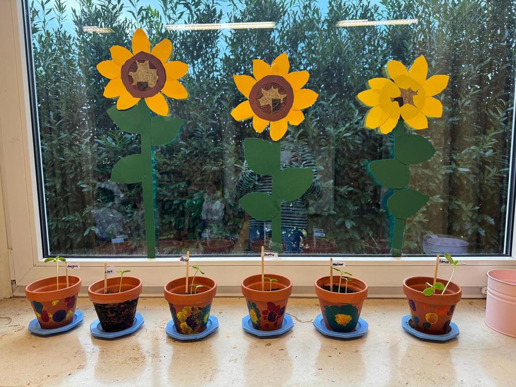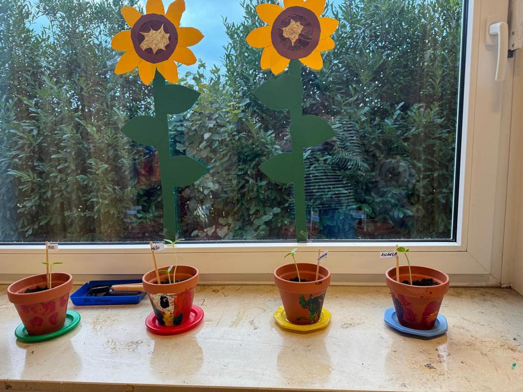 Unser Schulkindergarten beobachtet gerade Sonnenblumen beim Wachsen.