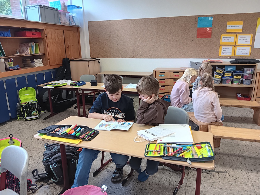 Jedes Kind der ersten Klasse hat am gestrigen Tag eine fantasievoll bemalte und farbenfrohe Lesetüte erhalten, die die Patenkinder aus der dritten Klasse gestaltet haben. Darin enthalten ist ein Erstlesebuch und ein an die Eltern gerichtetes Begleitschreiben. Im Anschluss lasen die Paten ihren Patenkindern noch ein kleines Stück aus dem Buch vor.