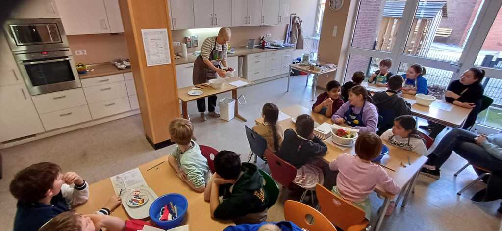 In der dritten oder vierten Klasse machen die Schülerinnen und Schüler unserer Schule den aid- Ernährungsführerschein. Gemeinsam mit dem Kater Cook lernen die Kinder in sechs Doppelstunden, ein leckeres Frühstück und kleine Gerichte für ein Mittag- oder Abendessen zuzubereiten. Dabei erfahren die Kinder viel über ausgewogenes Essen und Trinken und üben, mit Lebensmitteln und verschiedenen Küchengeräten umzugehen. In einer schriftlichen und praktischen Abschlussprüfung zeigen die Schülerinnnen und Schüler schließlich, was sie gelernt haben.